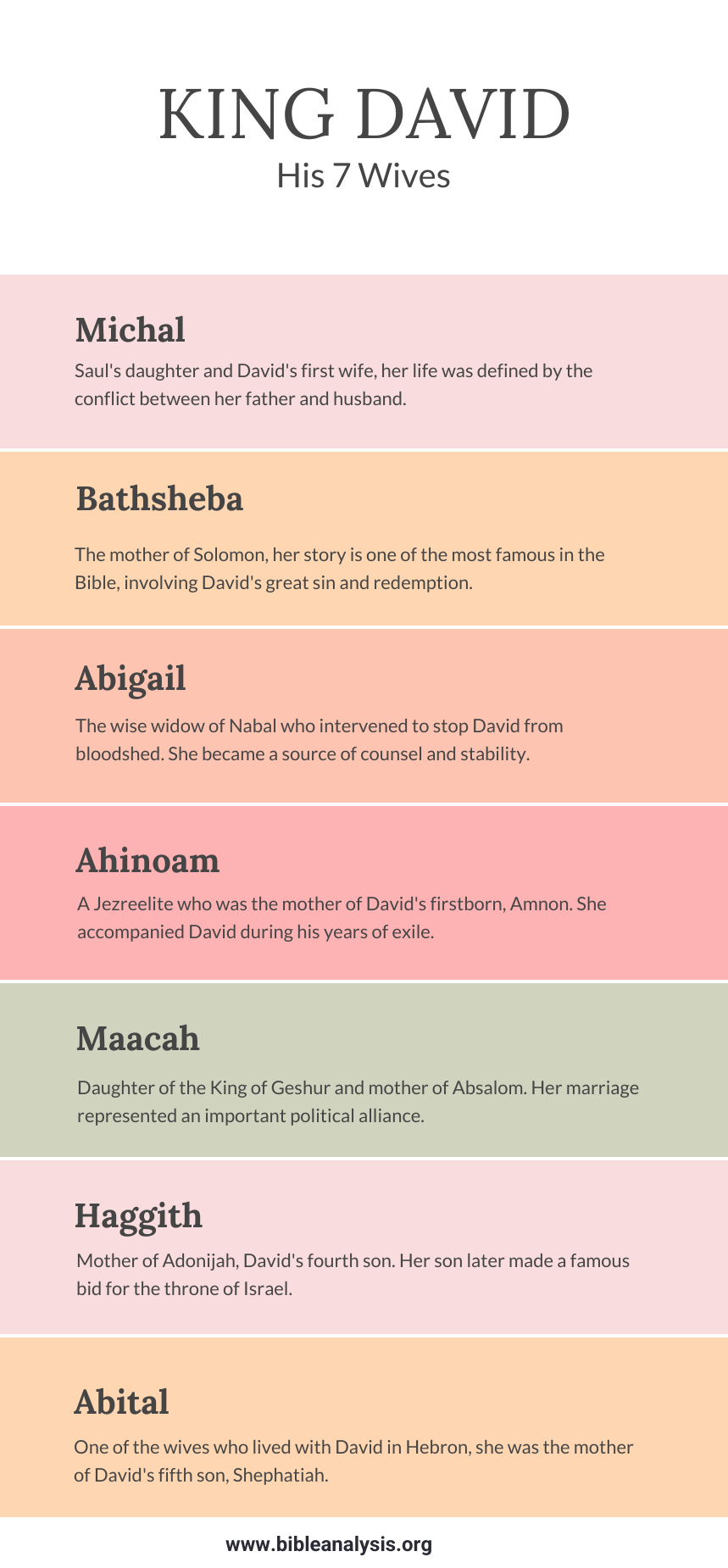 Bathsheba's story is one of the most well-known regarding David’s wives. Initially, she was the wife of Uriah the Hittite. David’s illicit relationship with her led to Uriah’s death in battle. Afterward, she became David’s wife and the mother of Solomon, who succeeded David as king. Bathsheba’s complex relationship with David and her role in Israel's history as the mother of a future king make her one of the most significant figures in David's life.