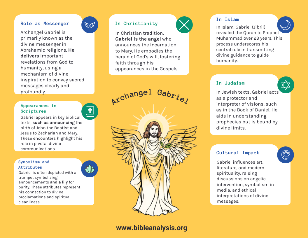 In Judaism, Gabriel is an angel of judgment and strength. In Christianity, he is central to the Annunciation and venerated as an archangel. In Islam, Gabriel (Jibril) revealed the Quran to Muhammad and is considered the greatest angel.