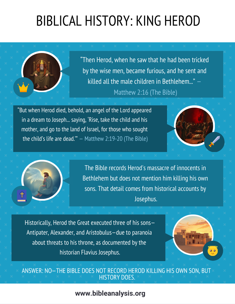 However, the Bible does not directly record Herod killing his own sons. The Gospels focus on Herod’s actions regarding Jesus and the children of Bethlehem, not on his internal family affairs. It is from historical sources, especially Josephus, that we learn of Herod’s tragic and violent relationships with his sons.