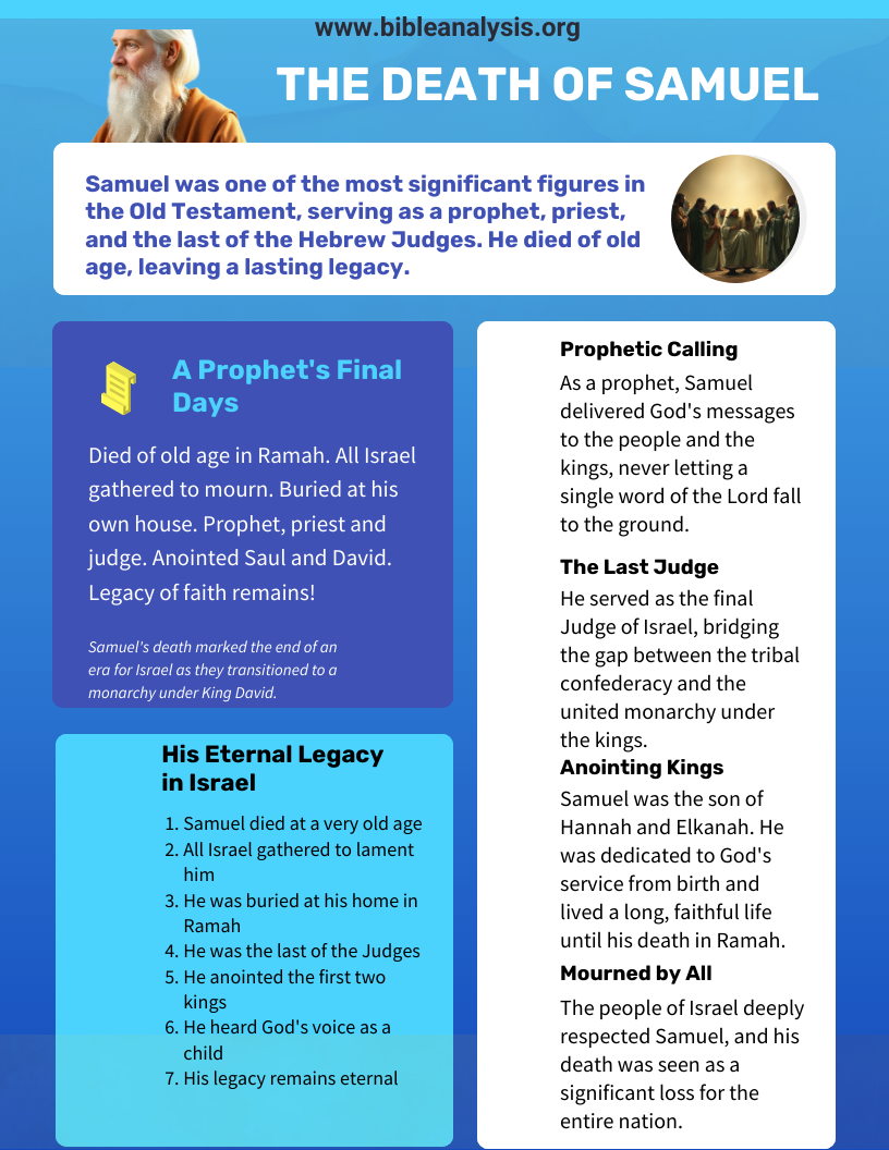 Samuel’s life and ministry serve as a testament to faithfulness to God and the importance of prophetic leadership, and his death highlights the transition from divine guidance to human monarchy—a shift that would shape the future of the nation. In reflecting on how Samuel died and the circumstances that followed, we are reminded of the importance of legacy, faithfulness, and the critical role of spiritual leaders in guiding a people in their covenant relationship with God.