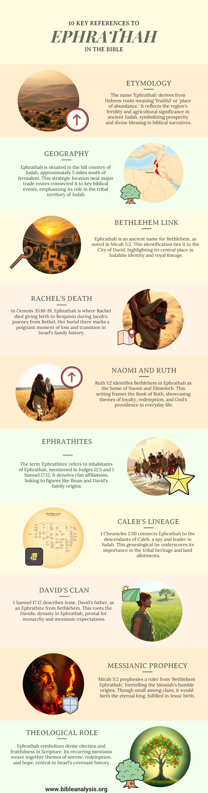 Ephrathah is often linked with Bethlehem, which means "house of bread," suggesting a connection between the two names. The fruitful quality implied by Ephrathah can be seen as a metaphor for growth and blessing, resonating with the biblical theme of God’s provision for His people.